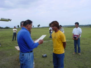 the condition of the weak wind. Fly-Off Round 1 Mr. Sensui gets high points, at the top. Both Mr. Kunii, Mr. Kobayashi showed us a perfect flight. Mr.Dobashi's engine stopped at the aerobatic manoeuver. Fly-Off Round 2 Mr.Sensui showed us a perfect flight again. Mr. Sensui gets more than 300 points, at the top. Both Mr. Kunii, Mr. Kobayashi showed us a perfect flight again. Mr.Dobashi participated with the new engine. Though wonderful performance was done, he fell down by the Autrotation landing due to the trouble of the landing gear. |