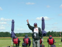 | Yさん(仮称)、Tさん(仮称)からの現地報告が入りました。 応援団長ならびに応援して頂いている皆様有難うございます 決勝第1ラウンドは予定通り7時開始となりました。 天候は晴れ左風4〜5m/sで、今日はイコールコンディションで行えそうです。 トップはヤングブラッド選手で風があるため静演技の上下動が目立ちますが、上空はかなり正確に図形をトレースしています。 続く伊藤選手は静演技の流れは良いが上空はヤングブラッド選手と比較するとやや劣るようにみえます。 得点的には同じ位か、ややよいかなという感じでしたが得点差が21点もありました(なんでそんなに差があるのだろう??) 8番手土橋選手の番になると、前風が強烈に吹いてきて、前風の為、縦ものの上がりも悪く、爆発撃沈(なんで決まったように風が吹くのでしょう) 11番の橋本選手の時も、テントがバタバタ音をたてるくらいの強風が吹き、土橋君の仲間入り。 14番泉水選手の時は風はあるものの押さえがきくくらいで無難にまとめていましたが、コブラロールの抜けでフレームアウト。 この後も風は弱くなったり、強くなったりの繰り返しで早い周期で変わります 第2ウンドも、ヤングブラッド選手、伊藤選手は風を味方につけ、土橋、橋本選手は風に嫌われる展開です。 泉水選手はその中間くらいでなんとか無難にフライトはできています。 第3ラウンドもなぜか不思議に風のめぐりは変わりません ヤングブラッド選手も打ち方を変えたのかあまり風に絡まなくなり、上空はますます良くなってきました。 伊藤選手が次にフライトするため非常に比較しやすく、静演技は同じくらいで、上空演技では差があります(点数では1.5点ですがもっとひらいているように身えます) ヤングブラッド選手も尻上がりによくなり伊藤選手を超えましたが、トータル得点では届かず伊藤選手が2連覇の世界チャンピオンに輝きました。 運も実力のうちと言いますが、今回まさにそのとおりでした。 伊藤選手、ヤングブラッド選手にはでたらめの風は無く、土橋、橋本選手には良い条件は無し、泉水選手はその中間位でした。 非常にハイレベルな戦いをおこなっているので風の影響は大きく、点数に影響します。 でも、気象条件ばかりはどうしようもないので、日ごろの行いを良くするしかないのでしょうか?? 世界選手権本当に終わってしまいました。 表彰式 KOMO注 選手の皆さんすばらしい演技ありがとうございました。 選手団団員の皆さん、お茶目で、我が儘なことも少しだけ言う選手達を、時にはおだて、時には尻をたたき、時には深夜まで機体の整備をし、選手が少しでも気持ちよく競技に出られるよう陰で支えていたのはKOMOも十二分にわかっています。 そして夜遅くまでかかっても毎日レポートとたくさんの写真を送ってくれましたレポーターさんの大変さもKOMOは十三分に分かっています。 競技場と練習場を忍者のごとく移動する選手の写真を撮ることは容易ではありません。 まして予選ラウンドでは遙か離れた別のラインの様子を一人でレポートできるはずはありません。 日本選手達でさえ大きく3つのグループで飛行場と練習場を移動しています。 たくさんのスタッフを配置できるだろうN●K、読●新聞がレポートしているならいざ知らず、行動範囲が限られた中で片手間にこれだけの報告していただいただけで十分です。 途中カーチスの写真が見たいと無理を言ったつもりではなくメールに書いたら、真剣に、これ以上の動きはむりですと返信してきたときには、KOMOも自分の浅はかさを反省しました。 でも、その後カーチスの機体写真を大量にアップしてくれました。 たぶん来月号のラジコン関係の雑誌には決勝日に間に合うように効率よく到着された日本の各雑誌社の皆さんがこれと同じものを大量に載せることでしょう。 おつかれさまでした。 とにかく無事に、とっとと帰ってきてください。 10月には日本選手権も控えてます。 風の静かなコンディションをご用意してお待ちしております。(本当か?) でも、今頃の時間は寝る間も惜しんで機体の梱包に追われているはず。 ワルシャワでの短期滞在の後帰国ですが、Yさん(仮称)、Tさん(仮称) 帰国途中のレポートできればよろしく。 ムリするな、ムリするなよと無理を言い。 応援団長 追伸 このレポートを読まれている、特に関東在住のみなさまへ。 8月26日に尾島で予定されているRCヘリフェスタ(MRHA主催)に日本チーム4選手が出場。 報告フライトを行う予定です。 真っ黒に日焼けした選手達に逢えます。 もちろん関東のみならず、尾島は沖縄や北海道からでもポーランドに比べれば比較的近い場所にありますのでどうぞ。 MRHA関東支部長よりのお誘いでした。 |