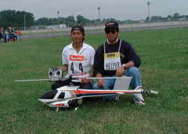 決勝第1ラウンド(FLYOFF 1st Round)が終わりました。 結果は 決勝第1ラウンド時点の個人成績 参考(最終成績の集計方法 FAIルールより) ・決勝ラウンド出場者は予選ラウンドの上位15名(全出場者の20%) ・出場順はランダムドロー(無作為抽選による) ・予選ラウンドの合計点数を最高得点者の得点を基準に1000分率点に 再集計し、これを1個のラウンド分とする。 ・決勝ラウンドはスケジュールBを使用し、各ラウンド毎に最高素点を基準に 1000分率点を算出。 ・決勝ラウンドを3ラウンド行い、これによる3個の得点と予選ラウンドで得られた 1個の得点のうち最も低い1個のラウンドを切り捨て、3個のラウンドの合計得点を 選手の最終得点とする。 決勝第1ラウンド。。。。。 天候の影響は出場者15名全員同じようなものでした 日本選手4名とも大健闘しています。 決勝に残らなかった選手も全員観戦の中で行われます。 日本ではまずないのですが、すごい演技の時には観戦者から 拍手が起こります。 オートロの接地の時は全員に拍手が起こります。 本日の圧巻は泉水選手のプッシュオーバーとコブラロール 会場にいる選手からものすごい拍手が起こりました。 (得点は9〜8.5がついています) 演技中に起こった拍手は全員の演技のうちこれだけでした。 やってくれたぜ 結果として橋本選手がラウンドの最高点となったため、予選に 引き続き1000点2個をとったことで、リーチというか王手というか かなり有利な立場とはなりましたが全選手が次のラウンドを狙っています。 本日は午後は競技なし(運営役員の休養日) すべては残り2ラウンドで決まります。 情報はここでも、 イギリスチームのマーク・クリスティ選手のお父さんが現地から友人のHP に情報をアップ中 http://www.btinternet.com/~aspenadvertising/ 当然我がHPとも相互リンクします。 決勝第1ラウンドを終えた日本選手たち 全員元気です ????????? 下記の表はランダムドローの結果発表されたFLYOFFの飛行順です。 KOMOは統計学は専門ではありませんので意見は控えますが、 15名を無作為抽選した結果、日本、独逸、米国の順に3カ所も並ぶ 確率はどのくらいでしょうか。 審査員は全員新人ですのでこのような並びだと見やすいでしょうね。 この表が、夕食中のホテルに本部からFAXされてきたとき、米国の チームマネージャーが我々のテーブルに来て、天文学的な抽選だと わめいていました。