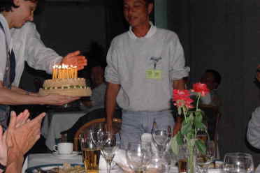夕食の話題で思い出しました。。。。。 8月18日は泉水選手の誕生日です。 阿部団長の計らいで、夕食中の部屋の明かりが消え キャンドルのともったケーキが運ばれてきました。 他チームの方もふくめて祝いました。 おめでとうカズユキ