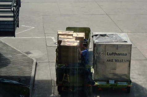 早朝で、薄暗い空港内で大荷物は相当目立ちました。 ワルシャワからルフトハンザ機にて経由地のフランクフルトへ 日本からワルシャワに向かう時にVol.4で、ヘリを入れてある大箱に、壊れ物とか、天地無用とか英語で大書してあるのですが逆さ、横倒しで運ばれたのを見たと書きました。 さて、今回はどうでしょうか。 次の写真を見てください。 見ていた選手たちからはあきれた声しか出ませんでした。
