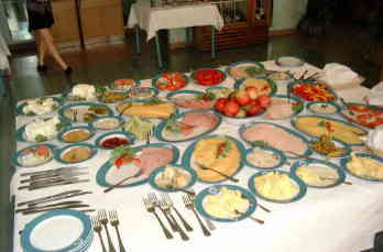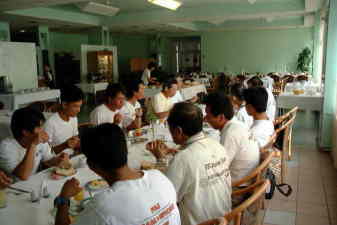 | 雨の中、真夜中に到着し一夜が明けました。 8月11日、朝食のテーブルに定刻の8:30に全員が集合。 窓の外は、昨晩の悪天候が嘘のように青空が広がっています。 今回の世界選手権では、二年前に行われたF3Aの選手団の報告から気がかりなことがあったのです。 食事の味がとても合わないという内容でした。 国柄か味や材料が特殊なものが多いとのこと。 実は、これに関してはF3A日本チームだけでなく全外国選手や役員の感想だったため、一種の社会問題となったとのことでした。 そのため、今回のホテルやサイトの食事メニューはかなりの変更が加えられたと聞きました。 実際、朝食もサイトでの昼食も準備されたものは十分満足のいくもので、主催者の心遣いが感じられます。